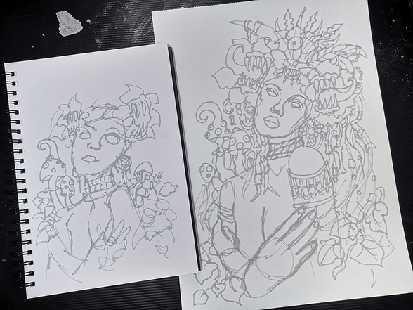 Einen Titel für ein Kunstwerk festlegen, finde ich immer sehr schwierig. Ich habe eine Bildidee, einen Gedankengang dazu. Setze es um und am Ende sind so viele Hintergründe/Gedanken zusammengeworfen, dass es schwerfällt, es in einem kurzen Titel zusammen zufassen. Ich notiere mir immer ein paar Schlagworte oder Musiktitel, die ich zum Zeichnen gehört habe. Zum Beispiel habe ich mir für dieses Werk "Traumerstickt", "schattenschwer", "Irrgeschwätz", "Lebensblüte" ... Aufgeschrieben. Die drei Pilze auf ihrer Schulter sind nicht nur niedliches Beiwerk, sondern eher der Mittelpunkt meiner Gedankengänge. Die Pilze zeigen verschiedene Emotionen und sind noch viel besser im Erklären und Zerdenken als ich. Richtige Meister im Schwatzen, Schwarzmalen, aber auch Aufpolieren von eigentlich ziemlich beschissenen Tatsachen. Irrgeschwätz - Irrgewächs. Alles irgendwie verworren, aber auch irgendwie klar. Dieses Pilzgeflecht gehört eben dazu. Ich bin halt echt nicht gut im Erklären meiner Bilder, aber ich habe wenigstens für diesen Ansatz alles gegeben; wenigstens versucht, ein Element irgendwie zu erklären. Manche Gefühle und Gedanken müssen einfach weg. Danach noch mal genauer hinschauen hat einen mulmigen Beigeschmack für mich.